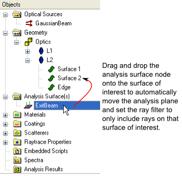 Alternatively, the analysis surface can be dragged and dropped from the Analysis Surface(s) folder on the object tree directly to the surface of interest. This will automatically position the analysis surface coincident with the surface and set the ray selection criteria to include only rays on that surface.