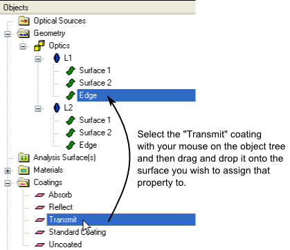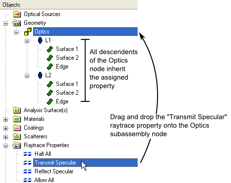 The drag and drop assignment method can not only be applied to an individual surface, it can use the object tree's hierarchy structure to assign properties to multiple surfaces at once. For example, assign the "Transmit Specular" raytrace property to the "Optics" subassembly node. Using the tree's hierarchy, every node which is a descendant (child, grandchild, etc.) of the Optics subassembly inherits the property being assigned.