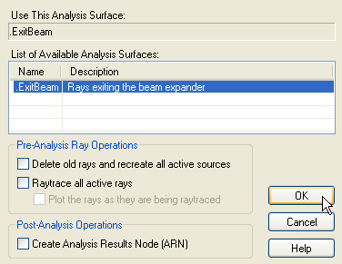List of Available Analysis Surfaces - If the model has more than one analysis surface the user must specify which to use Delete old rays and recreate all active sources - If the user wishes to re-create the sources rather than using the existing rays in the buffer Raytrace all active rays - If the user wishes to trace the current rays in the buffer before performing the analysis Plot the rays as they are being raytraced - If the user chooses to raytrace active rays and also wishes to see them drawn to the 3D view Create Analysis Results Node (ARN) - Creates a node in the Analysis Results folder on the object tree that stores the results of the analysis being performed for later review in the FRED session
