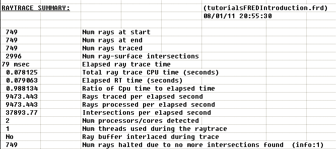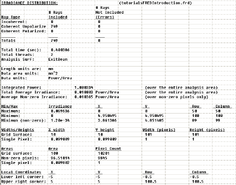 FRED's output window is extremely valuable for conveying information to the user regarding the most recently requested function. The user should always check the output window after performing a function for further insight in to model behavior and results. Consider the irradiance spread function that was performed in the previous section of this tutorial. At the conclusion of the analysis, the following information was printed to the output window: