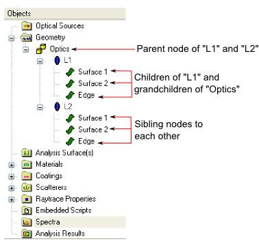Each entity on the object tree is referred to as a node. The indentation structure of the tree indicates parent/child relationships. For example, L1 is a child node of the Optics subassembly. Conversely, the Optics subassembly is a parent node of both L1 and L2. Going one level further, the base surfaces of L1 (Surface 1, Surface 2 and Edge) are grandchild nodes of the Optics subassembly. Following this convention, the surfaces Surface 1, Surface 2 and Edge of lens node L1 are siblings. These relationships are diagrammed below for clarification.