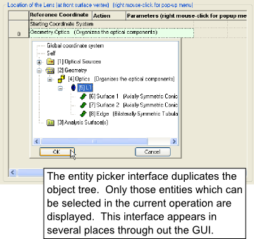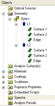 Although there are surfaces with duplicate names on this object tree (Surface 1, Surface 2 and Edge), each surface occupies a unique space in the hierarchy and therefore has a unique full name. For example, Surface 1 of L1 has the unique full name "Geometry.Optics.L1.Surface 1". Similarly, Surface 2 of L2 has the unique full name "Geometry.Optics.L2.Surface 2". How is this full name constructed? Start at the parent folder on the object tree and move down through the hierarchy, appending the name of each node until you reach the desired entity. In our example of Surface 1, the flow is Geometry > Optics > L1 > Surface 1 to construct "Geometry.Optics.L1.Surface 1". If you look back at the entity picker tool dialog, you will recall that the coordinate system was referenced using the entity's full name.