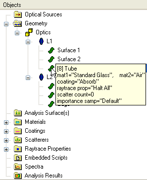 In the image above, the tooltip displays that the surface "Geometry.Optics.L1.Edge" has the following properties: •Node # = 8 (primarily used for scripting access) •Surface type = Tube •Materials assigned = Standard Glass and Air •Coating assigned = Absorb •Raytrace property = Halt All •Number of scatter models assigned = 0 •Number of importance samples assigned = 1 ("Default")