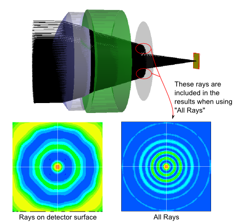 Ray Selection The ray selection is critical in setting up a proper analysis. Internally, each ray is "associated" with a source or surface in the model. This ray's association is with the last entity that ray intersected during the raytrace. At the completion of a non-sequential raytrace, rays can be associated with virtually any entity in the model and the user must define which subset of these rays are to be included in the analysis results. Consider the default ray selection criteria: AND All rays This criteria literally means that all rays (regardless of their current location) should be included in the analysis results. Any rays which are not stopped at the position of the analysis grid will be propagated free space along their current trajectory to intersect the analysis grid. Consider the following system which focuses a beam down through a clipping aperture to a detector plane. The analysis plane is located at the detector plane and the irradiance distributions are shown for two different ray selection criteria; only rays on the detector surface (left) and the default All Rays (right). The distribution shown on the right for the All Rays ray selection criteria includes the contribution at the detector plane from those rays which are halted at the aperture plane. The distribution on the left, which filters only rays on the detector surface, shows the effect of the aperture.