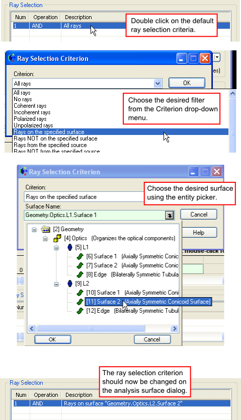 There are two ways to set the ray selection criteria for an analysis surface, manually within the analysis surface dialog or by drag and drop on the object tree. The following steps can be taken to manually change the ray selection criteria from the default "AND All rays" to a filter which only include rays that are associated with the specific surface.
