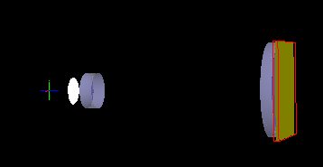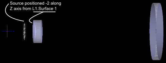 For the final step, shift the entire "Optics" subassembly 5 units along +Z. Right mouse click on the "Optics" subassembly node on the object tree and select "Position/Orientation" from the context menu. The position orientation dialog's functionality is identical to the embedded versions discussed earlier in the lens dialogs. Right mouse click in the spreadsheet area and choose "Append" to add another operation to the list. Set the new operation's type to "Shift in Z direction" and enter a value of 5. Hit "OK" and notice that the 3D view is updated. It is also important to note that L1 and L2 were shifted with the subassembly (remember, they are linked together) but have maintained their relative positioning with respect to each other.