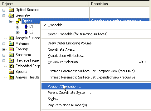 Change L2's starting coordinate system from the "Optics" subassembly to "L1" by mouse clicking on the text "Geometry.Optics (Organizes the optical components)" to activate the cell. Notice that there is now a black arrow on the right side of the cell. Click on the black arrow to activate what is called the Entity Picker Tool and then choose the "[5] L1" node from the interface and hit "OK". Entry #0 for the L2 node should now read "Geometry.Optics.L1". These steps are clarified in the images below.