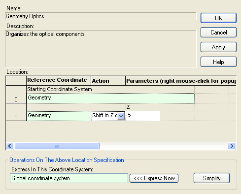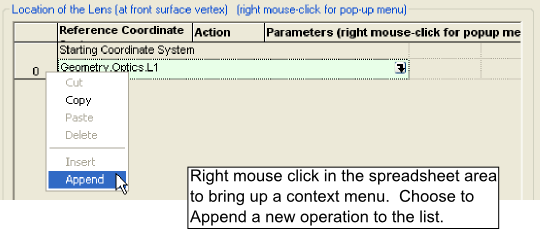 Create the second lens by right mouse clicking on the "Optics" subassembly node in the object tree and selecting "Create New Lens" from the context menu. Notice in the middle of the lens dialog that there is a section called "Location of the Lens (at front surface vertex)". This section of the dialog is used to control the position and orientation of the lens element. Entry #0 is the starting coordinate system for the lens element. In FRED, any object is allowed to be positioned relative to any other object. This is a very powerful feature because the user only has to know how objects are positioned relative to some reference, rather than knowing the explicit global coordinates. Additionally, it means that the user can move entire groups of objects at once while maintaining their relative configuration.