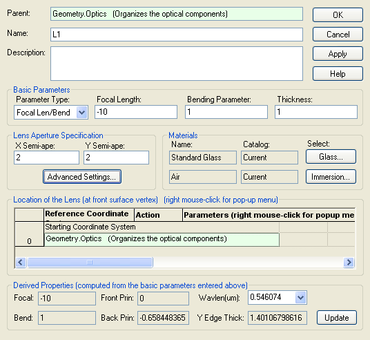 Create the first lens by right mouse clicking on the "Optics" subassembly node and selecting "Create New Lens" from the context menu. Enter the parameters for lens "L1" into the lens dialog and hit "OK" to accept the settings. Note that the "Optics" subassembly node now contains a child lens node named "L1". You can always double mouse click on an entity on the object tree to re-open that entity's dialog for editing.