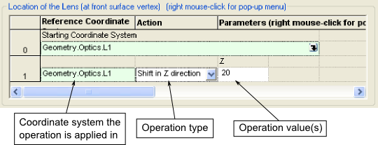Now add the Z-shift to lens "L2". Right mouse click in the spreadsheet area of the operations list and choose "Append" from the context menu. The new row (operation #1) defaults to a "Shift" type operation with five columns. The first column is the coordinate system in which the operation will be performed, which can be selected using the entity picker interface. The second column sets the operation type, which can be selected from the drop-down list. The number and meaning of the remaining columns will depend on the type of operation that was selected. Using the drop-down list, set the operation type to "Shift in Z direction" and enter a value of 20. After hitting the "Apply" button on the lens dialog the 3D view is automatically updated.