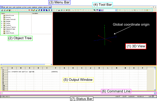 Introduction to the Graphical User Interface FRED has a multiple document interface, which means that you can have many different files open simultaneously. Create a new document in FRED by going to Menu > File > New > Fred Type. The graphical interface of a FRED document is grouped into seven unique components: 1. 3D View The 3D View is updated in real time as components are added to the model and can be interactively manipulated with the mouse and keyboard. 2. Object Tree The Object Tree is an organizational structure that allows construction of objects, sources and optical properties as well as property assignments. Each object type is stored in the appropriate folder of the object tree and each folder can be expanded to show the objects that are contained within it. As objects are added to the model, the object tree is updated automatically. 3. Menu Bar The Menu Bar is a generic way to access any of FRED's features (file operations, object creation, analyses functions, etc). If the user is unsure where/how to access a function, the Menu Bar is a likely place to look. 4. Tool Bar The Tool Bar can be customized to contain buttons which provide quick access to commonly used functions. 5. Output Window The Output Window displays information to the user whenever an action is performed. For example, statistical information is printed to the output window at the end of analyses and raytraces. The Output Window should always be checked for informative messages, since this will indicate any potential errors and provide insight for debugging and verifying system models. (TIP: Navigate to Menu > View > Output Window and toggle the "Cells" option to view the output window as a spreadsheet) 6. Command Line The Command Line allows entry of any of FRED's scripting commands. For anything more complicated than a single command, it is best to use the script editor (not discussed in this tutorial). 7. Status Bar The Status Bar contains basic information about the current FRED document, including system and wavelength units.