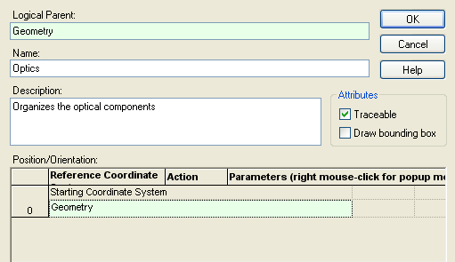 Start the construction of the simple beam expander by adding a new subassembly to the Geometry folder on the object tree. The subassembly is added first so that the optical components can be organized together and a unit on the object tree. •Right mouse click on the Geometry folder on the object tree and choose "Create New Subassembly" from the context menu. •Name the subassembly node "Optics". •Give the subassembly node the description "Organizes the optical components". •Click "OK" to accept the settings and close the dialog box.