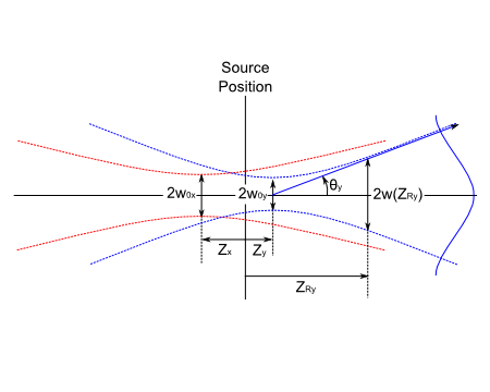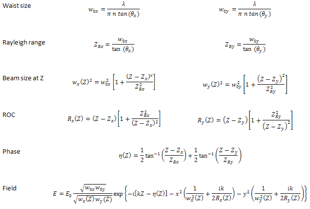 The Laser Diode Beam (coherent) type Source Primitive model represents an ideal Gaussian beam with axial astigmatism that is described by the following equations and schematic.