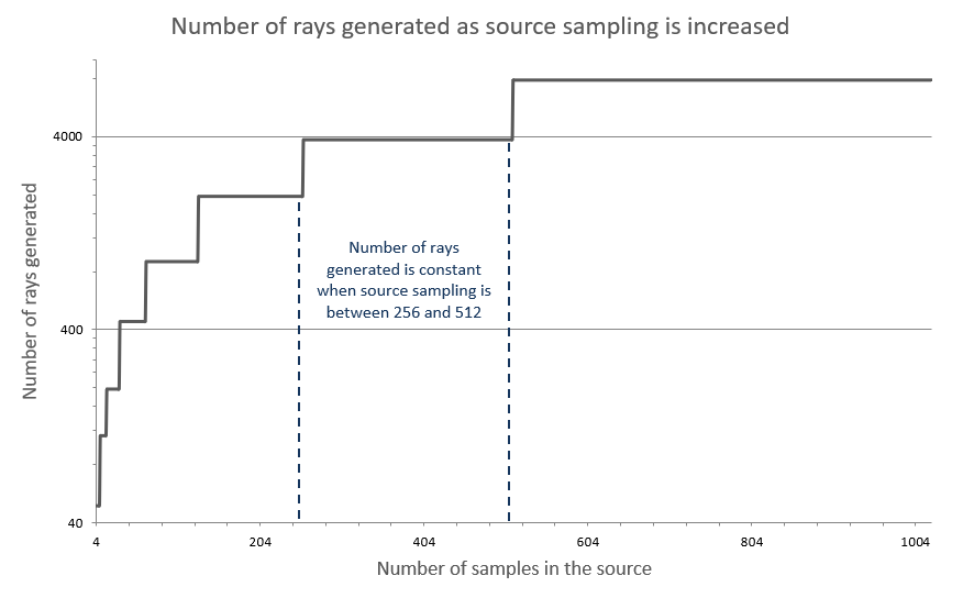 Internally, the field distribution is created using a Coherent Field Synthesis technique to ensure that the field is accurate over the full range of divergence angles between 0 and 90 degrees. Due to the requirements in this field synthesis algorithm, the user will observe that there is a relationship between the required X and Y sampling of the beam and the divergence angle of the source specification with regard to the number of rays generated during source creation. The field synthesis algorithm uses a Fourier transform in order to generate the rayset that properly represents the field and, consequently, the X and Y sampling should be adjusted in powers of 2 in order to jump to the next sampling plateau. For a given sampling specification in the range between 2n - 2n+1, no additional rays will be generated. This behavior is illustrated in the plot below, where the number of samples specified in the source is increased (all other source parameters held constant).