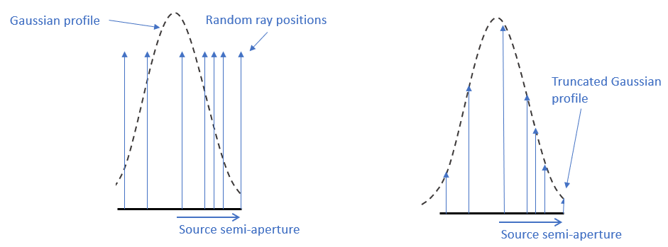 When the source semi-aperture becomes significantly larger than the beam width, then many rays are sampling the low-amplitude regions of the apodization function. These rays, while valid, will make relatively insignificant contributions to an overall distribution but cost the same amount of computation time to raytrace as rays with significant flux. Consequently, there is a trade between the area of the source aperture (or angular divergence) relative to the beam properties and the required ray sampling density and calculation time.