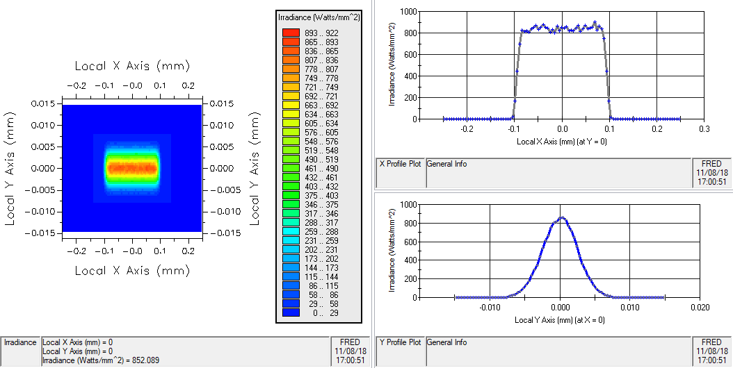 The image below shows the irradiance distribution (power/area) at the source aperture of a Laser Diode (incoherent) type Source Primitive with the spatial parameters given in the following table.