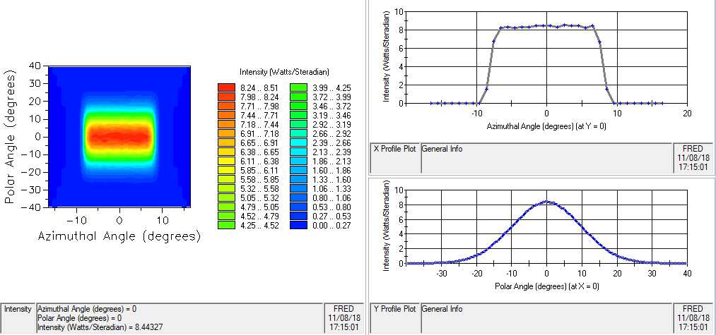 Similarly, the image below shows the intensity distribution (power/steradian) at the source aperture of a Laser Diode (incoherent) type Source Primitive with the directional parameters given in the following table.
