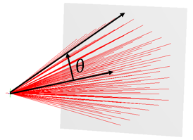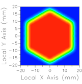 The Point Source (coherent) type Source Primitive approximates the spherical wave emitted by a point source over a requested semi-angle. Emitting from a single point, rays are generated that sample the requested semi-angle using a hexagonal grid in angle space. Figure 1, below, shows rays emitting from a point source with subtended half angle Q. Figure 2 shows the irradiance distribution formed on the plane a short distance away from the point source, where the hexagonal shape of the hexagonal sampling pattern is evident. The schematic in Figure 3 shows a representation of the corresponding ray sampling at the plane where the analysis is performed. As the sampling density of the rays is increased, the footprint of the hexagonal sampling will become less apparent. In this construction, the irradiance distribution at the point source location will show an Airy function corresponding to the NA of the specified emission angle.