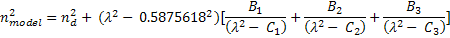 The Model Material type calculates the non-linear refractive index as defined by the refractive index and the Abbe V-number at the helium ‘d’ line (0.587562 mm) using a modified Sellmeier formula. This material type is an alternative to the Sampled Material for creating a glass model that is not available from any of the default catalogs. The modified Sellmeier formula used for the model material is the following: